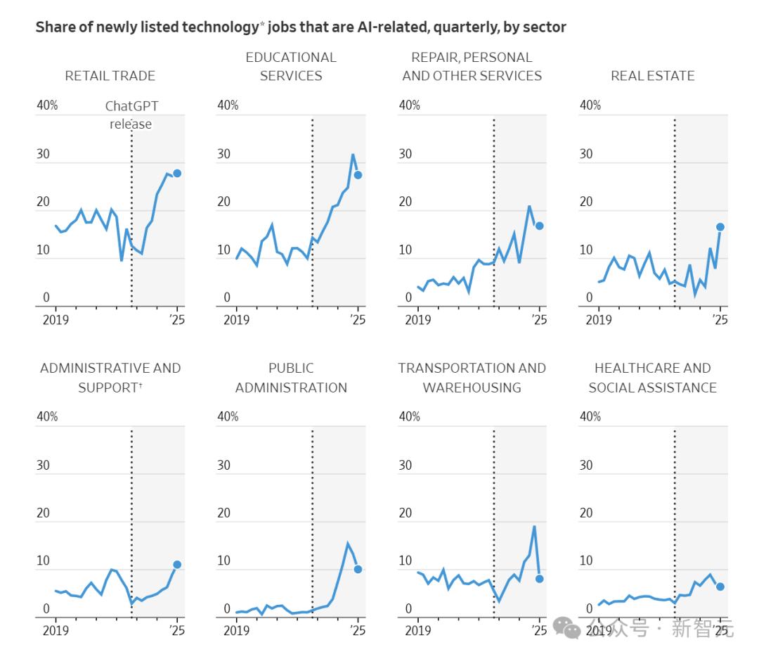 各行业新发布的与 AI 相关的技术职位占比(按季度)