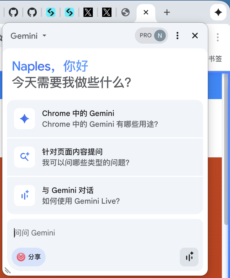 这三步完成之后,重启浏览器,你就能在最右侧看到 Gemini 的图标。点击即可开启谷歌 AI。