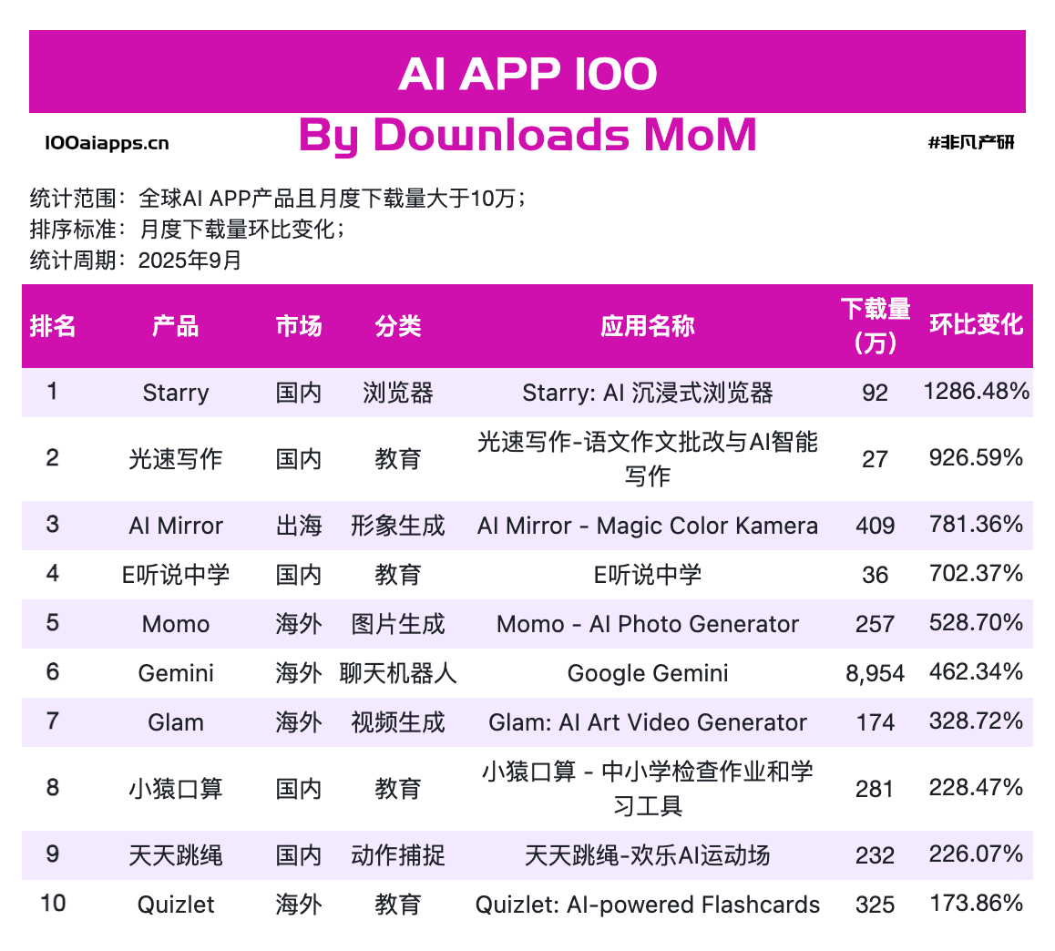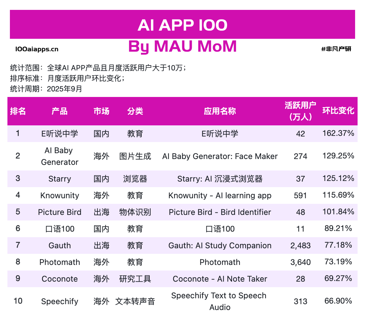 9 月的榜单依旧精彩:在 Top 10 增速榜上,你会看到“为读外文打造的浏览器”、“用 AI 训练口语的中学生英语工具”、“靠自拍就能产出短视频的影像生成器”、“能拍题解答还能做错因分析的教育助手”,甚至还有“预测你和 Ta 未来宝宝长相”的轻娱乐合成器。