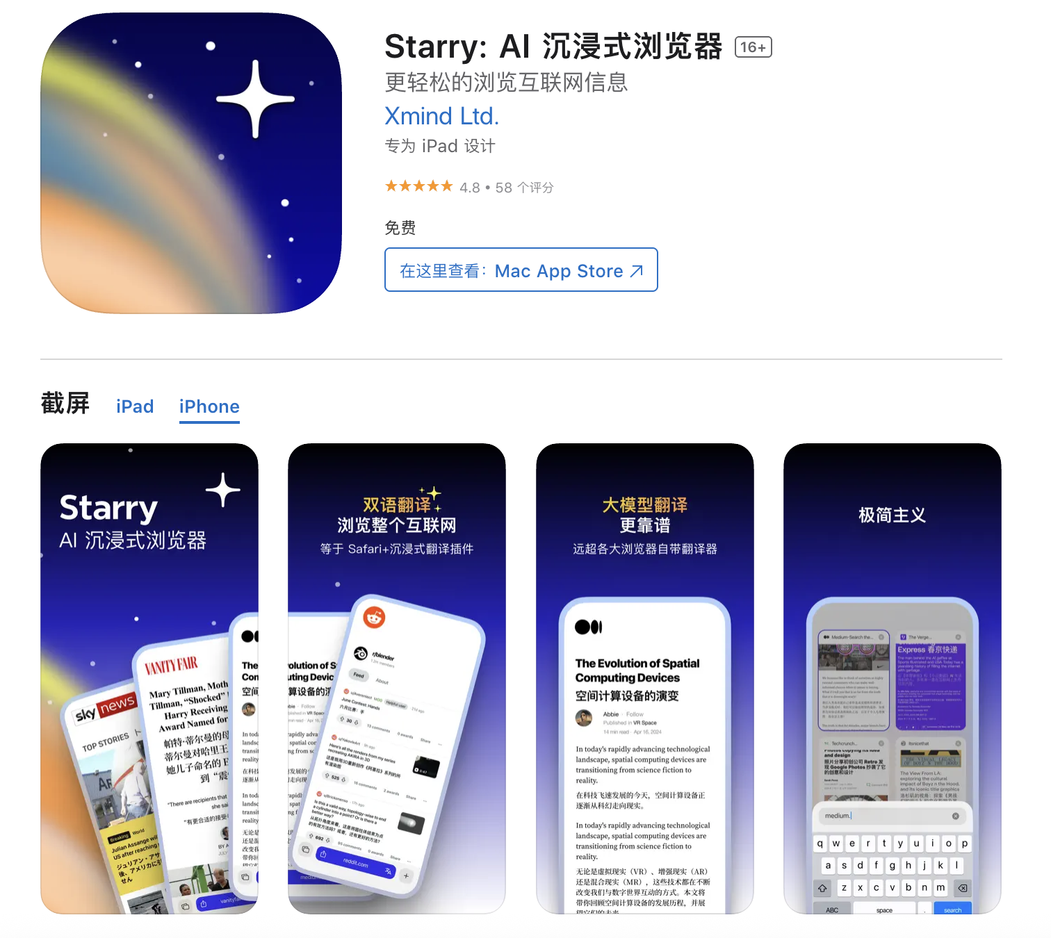 下载榜第一名的Starry 就是一个很好的例子。它不是一个简单的浏览器,而是“为读外文而生”的工具。它最核心的特点是“双语对照浏览”,让原文和译文并排呈现,既解决了理解问题,又保留了原文的语境。再加上内置的广告屏蔽和简洁的界面,它把“读懂外文”和“专注阅读”这两件事做到了极致。