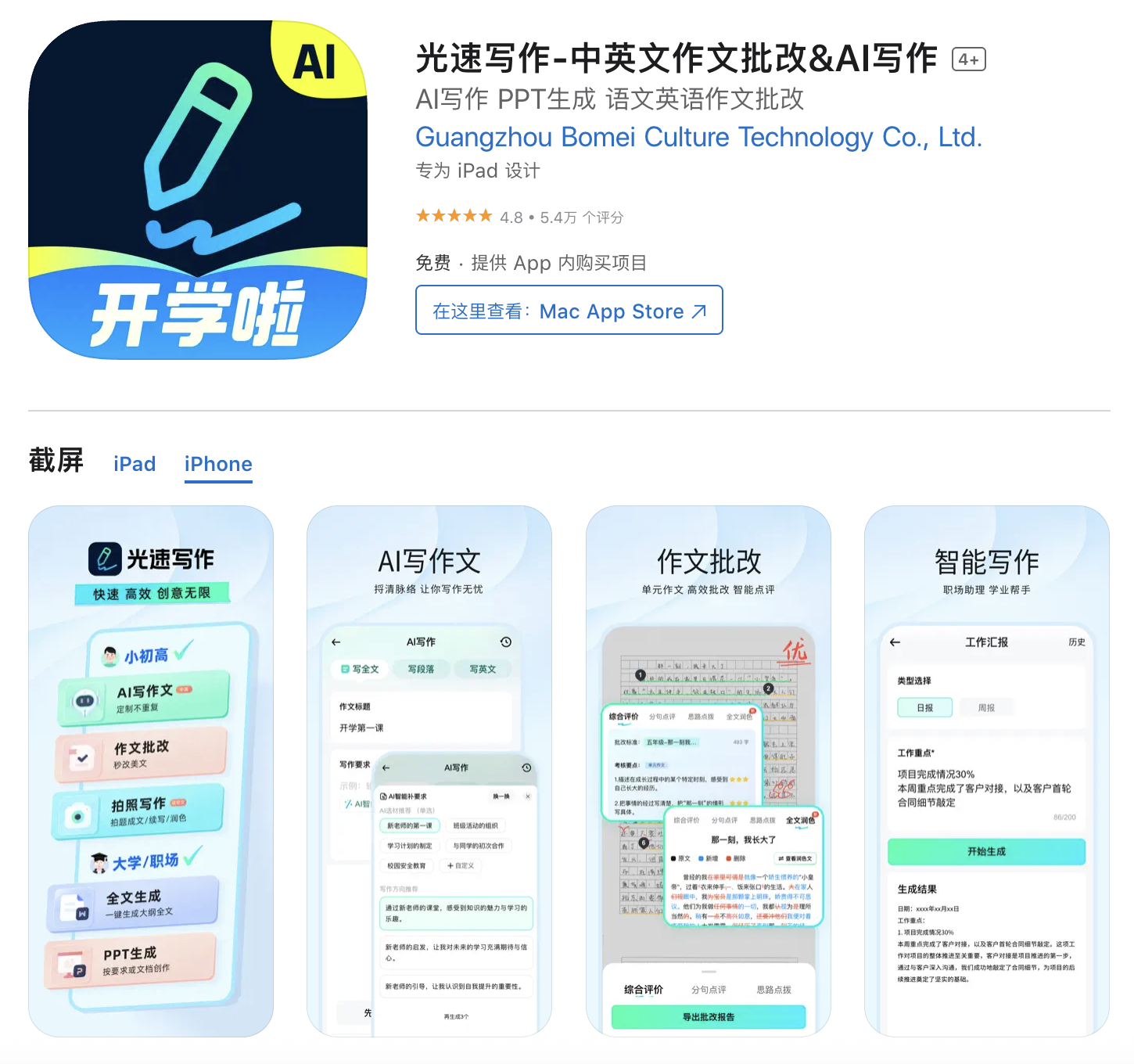 写作方面,光速写作 把从构思、起草到润色、批改的流程做成了模块化服务。它既能为学生生成作文、提供批改建议,也能为职场人士快速撰写新闻稿、活动策划等文案,并生成 PPT,覆盖了多个高频场景。