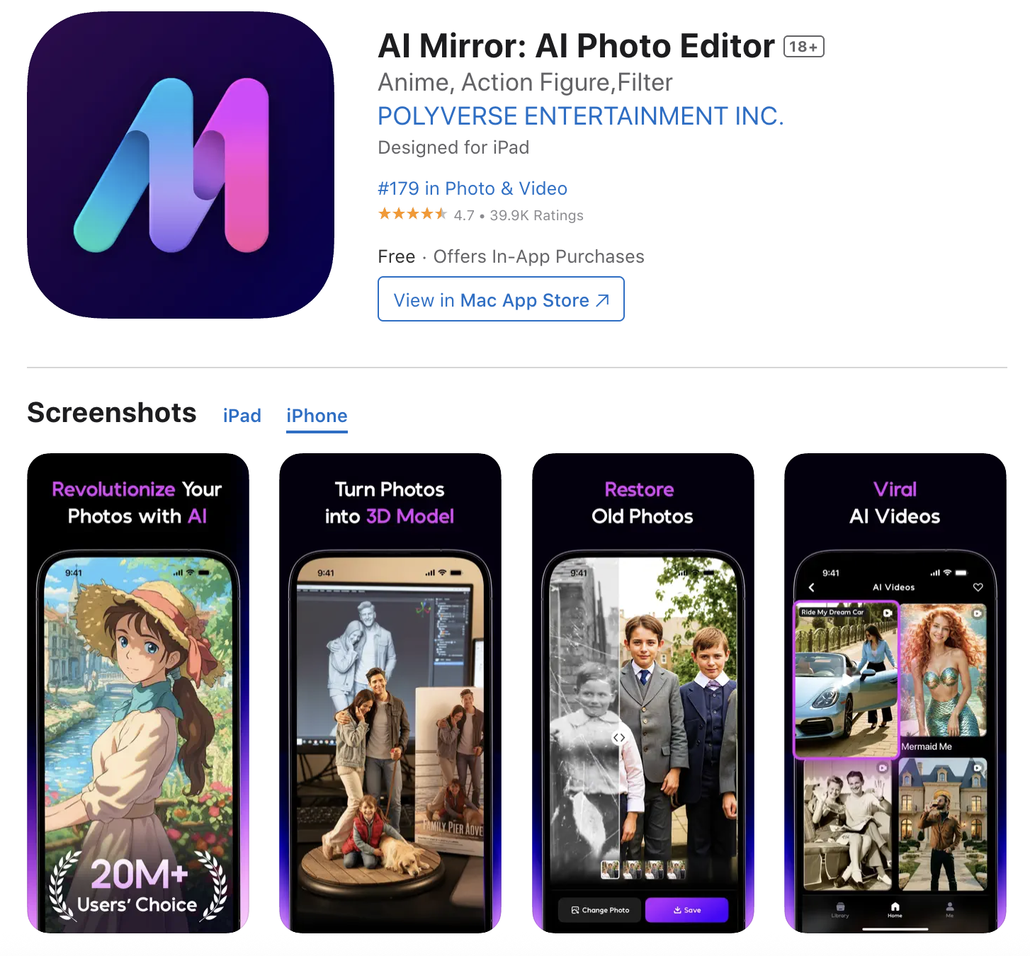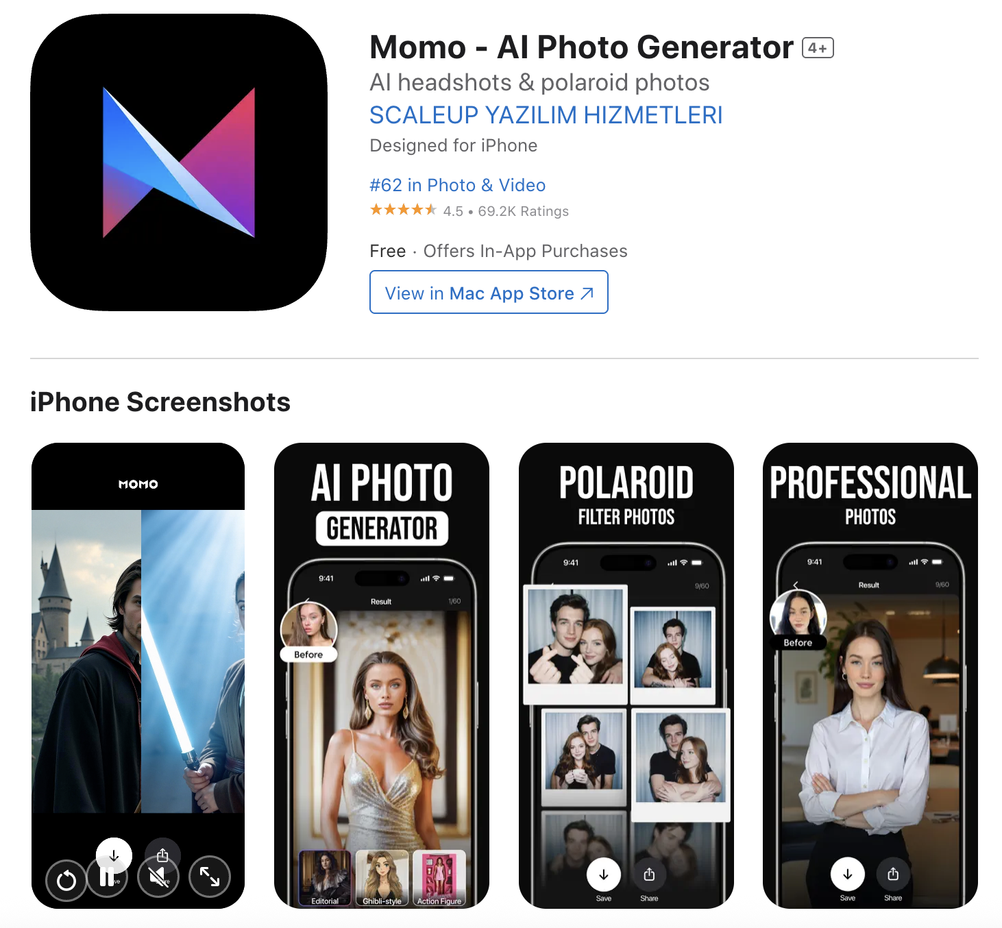 Momo 主打的是 AI 生成“在线形象资产”:你上传几张自拍,系统训练专属 Profile,然后一键生成符合不同主题的专业头像、旅行写真、甚至数字分身视频。对社交媒体创作者、求职用户、小品牌主来说,Momo 是一个“更新门面图”的流水线。它不光追热点,还做了老照片修复、风格滤镜包、KPop 风大片、妆容发型试换等功能,像是把一整个内容工作室装进了 App 里,降低内容创作的门槛与频率压力。