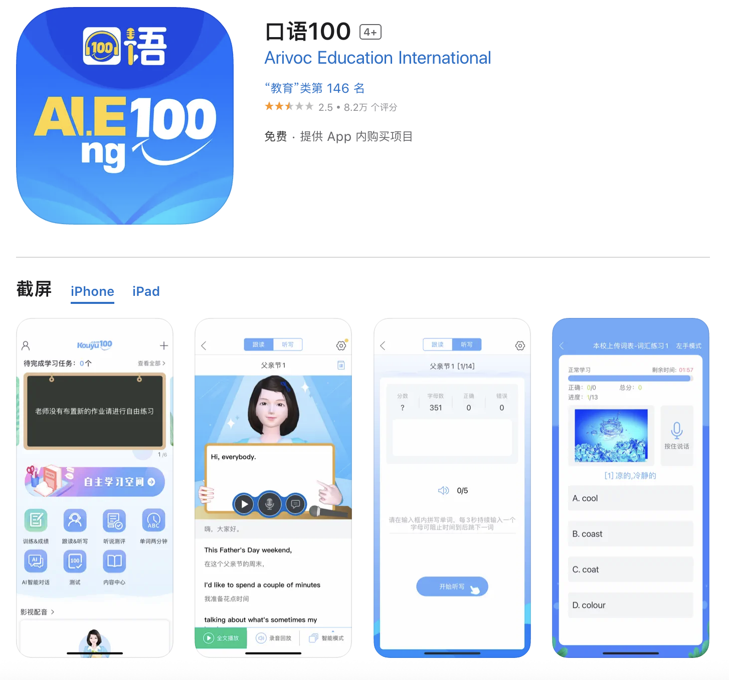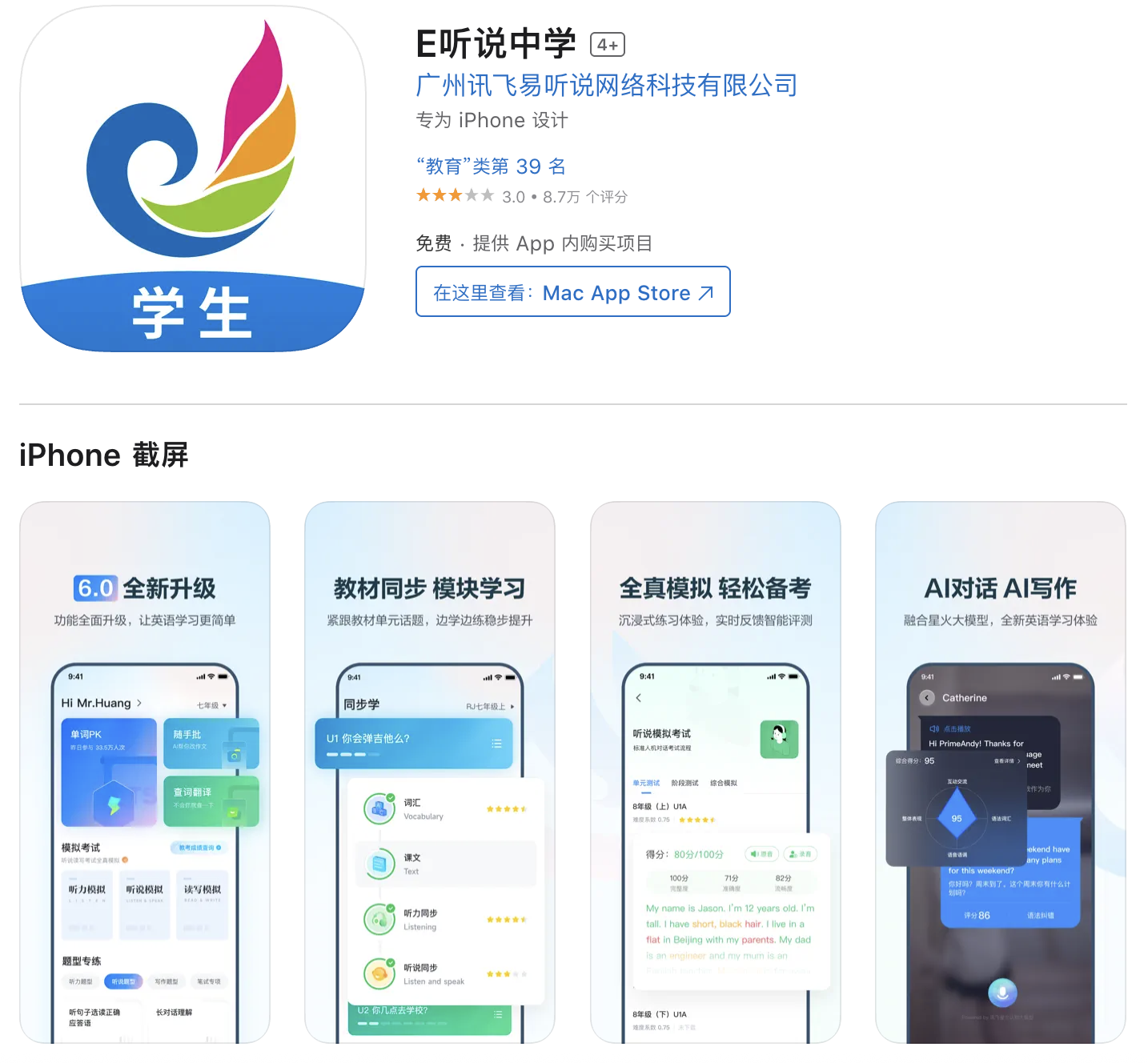 在语言学习方面, E 听说中学 和 口语 100 都精准地切入了校内英语听说练习的刚需场景。它们利用 AI 口语测评技术,对学生的跟读发音进行打分和纠错,甚至能细化到音节级别。这种标准化的评分反馈,既能让学生看到自己的进步,也方便老师布置和检查作业,把一项很难量化的能力训练,变成了可度量、可重复的工作流。