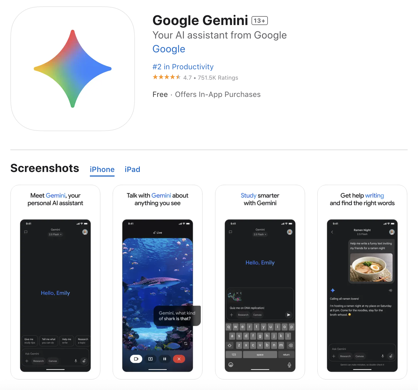 Gemini 是 Google 做的通用 AI 助手,移动端的定位尤其清晰:不是单一聊天,而是“知识处理+创作中枢”。你可以一边用它语音协作拆解复杂问题,一边让它总结 PDF、生成视频、整理笔记,甚至结合地图、Gmail、YouTube 等服务完成“查 - 看 - 做 - 发”的工作闭环。Pro 版本支持更长上下文、多模态视频生成等高级能力。Gemini 的策略是用生态整合、生成可交付结果、压缩完成路径,变成知识工作者手里的“第二大脑”。