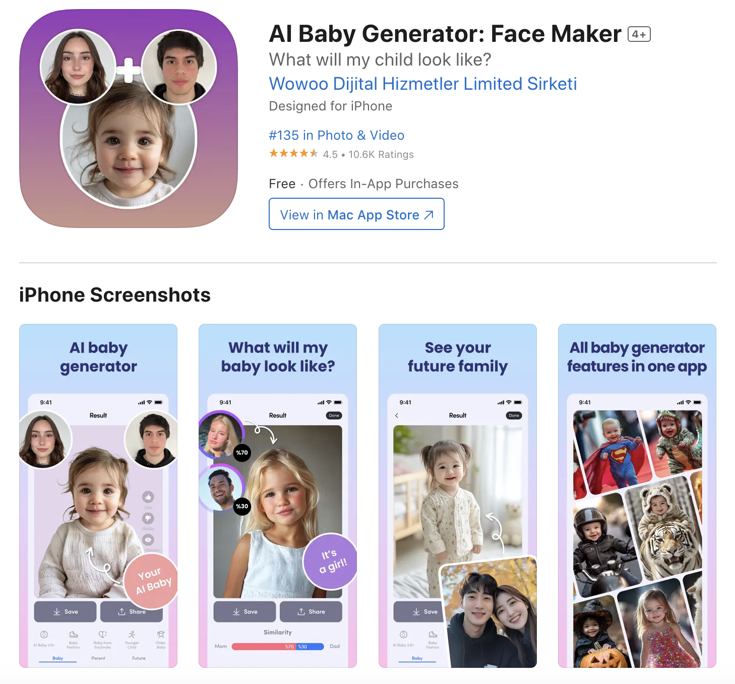 榜单上还有一个有趣的娱乐型应用AI Baby Generator 。它的功能很直接:上传情侣照片,预测未来宝宝的长相。它的增长逻辑不在于预测的准确性,而在于它创造了一个天然的社交话题,生成的结果非常适合在社交平台分享和讨论,从而驱动了快速传播。