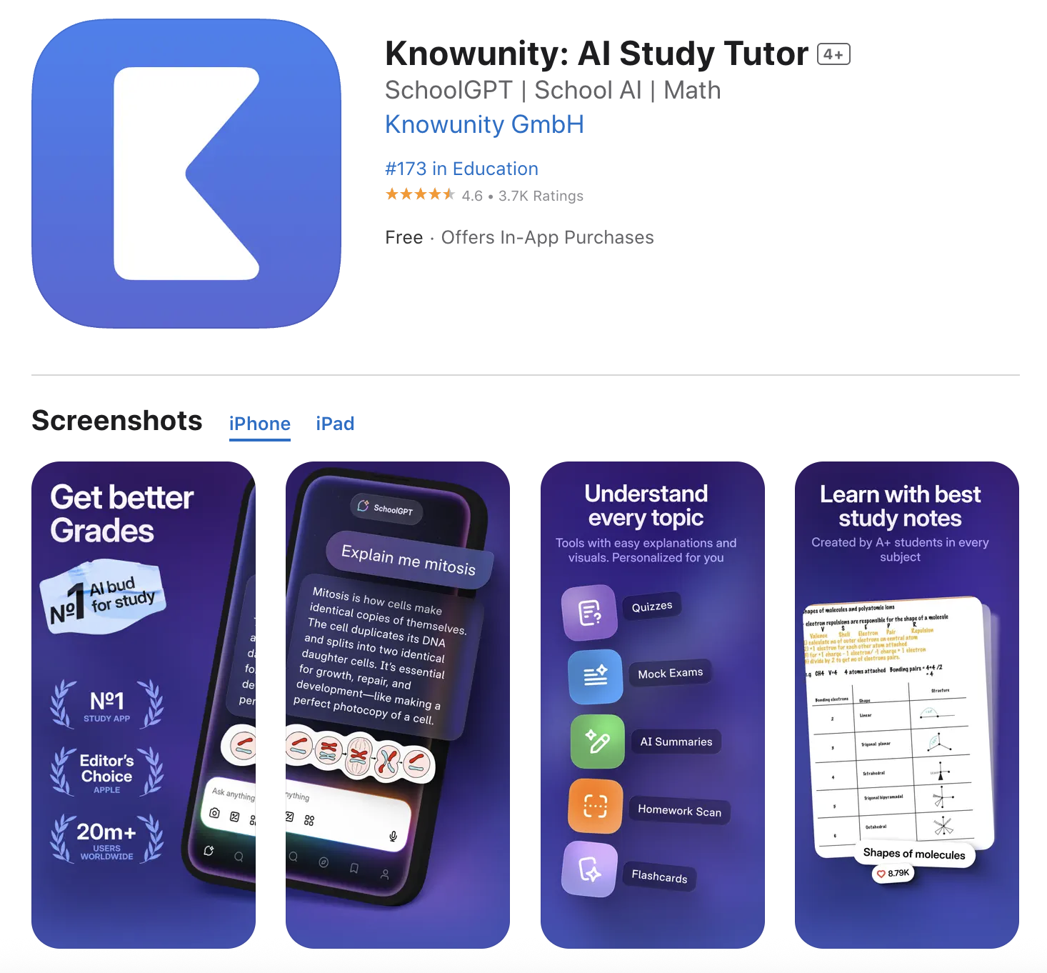 Knowunity 主打的是“从笔记到练习”的学习自动化流程。用户上传课堂笔记,AI 自动生成闪卡、练习题、写作建议,然后用游戏化机制鼓励每天“刷一点”。它还有数千万的同学笔记库可供搜索,配合错题拆解和备考建议,非常适合中学 / 高中生备战 AP/SAT 类考试。重点不是“内容有多少”,而是“我如何更快进入学习状态”。Knowunity 把这一流程做到极简顺滑,这就是它增长的秘密。