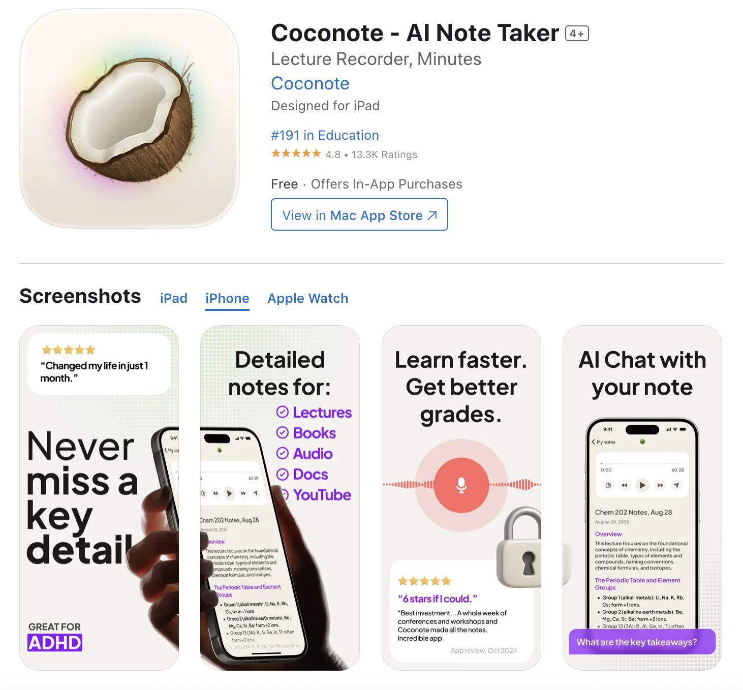 Coconote 把 AI 嵌入到了“课堂笔记”这个被忽视的场景中。你录一节课,它转成结构化笔记,再自动生成学习指南、练习题和测验。还支持 Apple Watch 录音、多设备同步、对话式检索笔记。这不是一个转录工具,而是“从听课到练习”的学习资产生成器。适合听课多、备考忙的学生,也适合老师与助教做内容总结。这个方向特别有潜力,因为它切中一个痛点:听得懂≠记得住,记得住≠考得好。