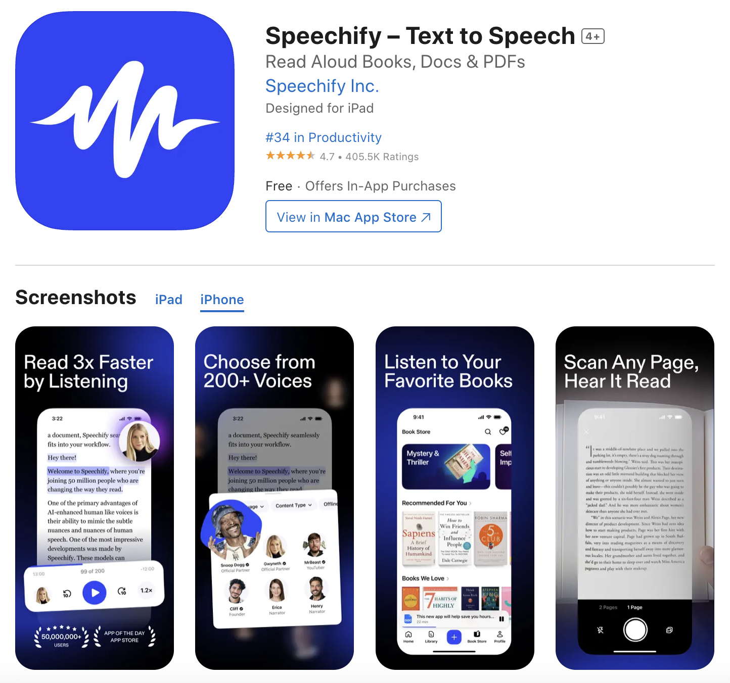 还有两款工具精准地切入了信息处理的细分场景。Coconote 解决的是“把声音变笔记”的问题。上课或开会时打开录音,它不仅能转写成文字,还能自动生成学习指南、练习题和闪卡,直接把听到的内容转化成可复习的材料。而Speechify 则反其道而行之,主打“把文字变声音”。它能用非常自然的人声朗读网页、文档甚至纸质书的照片,并且支持高倍速播放,让用户可以通过“听”的方式,在通勤、运动等场景下高效获取信息,尤其适合听觉学习者或有阅读障碍的用户。