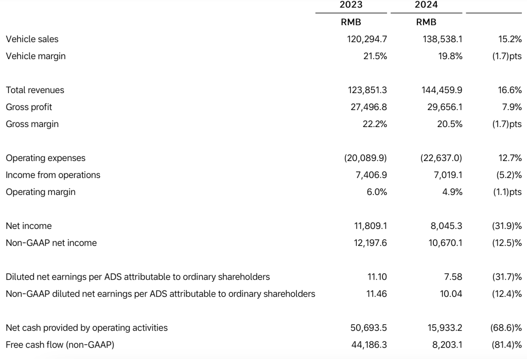 2024 年第四季度,汽车总交付量为 15.87 万辆,同比增长 20.4%。2024 年全年,汽车总交付量达到 50.05 万辆,较 2023 年增长 33.1%。
