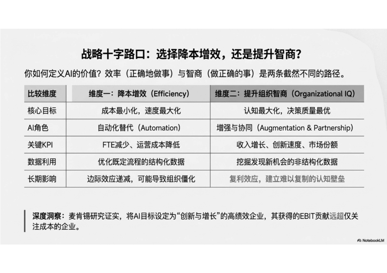 B端AI是看R还是I(ROI)HRIT 杂谈1个月前更新关注私信02815 如果从纳西姆·塔勒布的“反脆弱”理论以及控制论的视角来看: 1.对“脆弱性”的剖析:过度优化的陷阱 为什么说“只关注降本增效”会导致脆弱? 冗余即韧性(RedundancyisResilience): 在生物学和工程学中,系统的“韧性”往往来自于一定的“冗余”(Slack)。比如人有两个肾,飞机有备用引擎。 AI误区:如果用AI的目的仅仅是把“冗余”全部砍掉(例如:裁掉所有能够处理复杂例外情况的资深员工,只留标准化的AI客服),那么企业就变成了一个紧绷的、没有缓冲的精密仪器。 后果:这种系统在常态下效率极高(成本低),但一旦遇到“黑天鹅事件”(市场剧变、新型竞争对手、系统性风险),由于缺乏具备灵活性和判断力的人(冗余),系统会瞬间崩塌。这就是“刚极易折”。 组织失忆(InstitutionalAmnesia): 如果为了降本,用AI黑盒全面替代人工流程,而不保留理解业务逻辑的人,组织就会患上“失忆症”。一旦AI模型失效或环境参数改变,没人知道该怎么手动接管或调整方向。 2.对“组织智商”的剖析:进化的核心 为什么关注“组织智商”能带来韧性和成长? 感知与反馈速度(Sensor&Feedback): 高智商的组织,利用AI不仅仅是为了“做动作”(Execution),更是为了“感知”(Sensing)。 例子:一个关注组织智商的企业,会用AI监测全网舆情、分析内部员工情绪、预测供应链波动。这种全方位的感知能力,让组织在危机到来前就能做出反应(韧性),或者在机会出现时第一时间扑上去(成长)。 决策的分布化(Distributed Decision Making): 传统的降本增效是自上而下的控制。而高组织智商意味着AI赋能了每一个末端节点(一线员工)。 当一线员工拥有了AI赋予的“参谋能力”,他们就能在听得见炮火的地方直接做决策。这种分布式的高质量决策,是组织应对复杂性挑战的唯一解药。 3.价值维度的对比:存量vs.增量 降本增效(做减法): 它的上限是物理极限(成本不可能降为负数)。这是一场存量博弈,是在螺蛳壳里做道场。如果企业的战略重心全在这里,说明它已经丧失了想象力,进入了衰退期的防守心态。 组织智商(做乘法): 它的上限是无穷大。通过AI提升洞察力,发现新的蓝海,创造新的商业模式。这是一场增量博弈。只有成长的企业,才具有真正的抗风险能力。 4.总结评价 这句话可以被视为企业AI战略的分水岭: 初级玩家(1.0阶段):把AI当作“更快的马”。盯着财务报表,看重ROI(投资回报率)中的“I”(投入减少)。结果是把企业变成了一个高效但僵化的机器。 高级玩家(2.0阶段):把AI当作“外挂大脑”。盯着市场份额和创新速度,看重ROI中的“R”(回报增加)。结果是把企业变成了一个敏捷且聪明的有机体。 结论:在AI时代,效率是入场券,但智商才是护城河。一个因为“降本”而把“大脑”(人才和判断力)都裁掉的公司,是在为了省油而扔掉方向盘。 不妨先看个视频: < © 版权声明文章版权归作者所有,未经允许请勿转载。THE ENDAI 资讯 喜欢就支持一下吧点赞15 分享QQ空间微博QQ好友海报分享复制链接收藏
